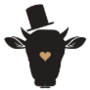 ハットと蝶ネクタイでおめかしした牛のロゴ。