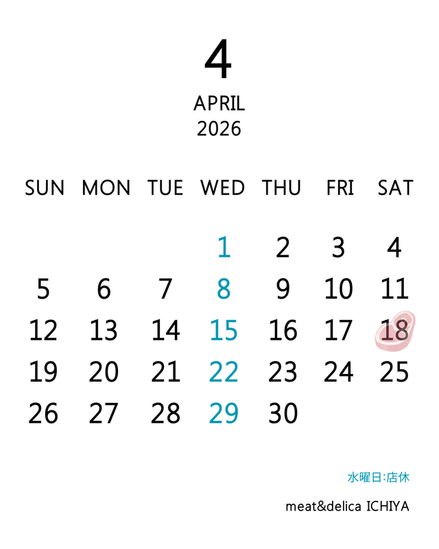 お知らせ 2026.04.01 2026.04 営業日カレンダー 【2026.04.01-04.30】営業日カレンダーを更新しました営業時間月火木金 12:00-19:00土日祝 12:00-18:00水曜日店休みなさまのご来店をお待ちしております☺meat&delica ICHIYA pdfはこちら